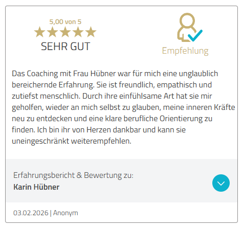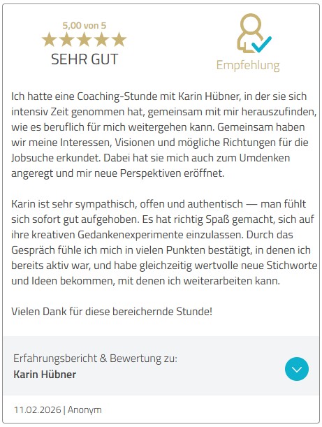 Erst wenn sich das stimmig anfühlt, planen wir deine nächsten Schritte ganz konkret. Wenn Bewerbungen dazugehören, begleite ich dich auch im Bewerbungsprozess von Unterlagen bis Vorbereitung aufs Gespräch, Gehaltsverhandlung und die 100 ersten Tage im Job.